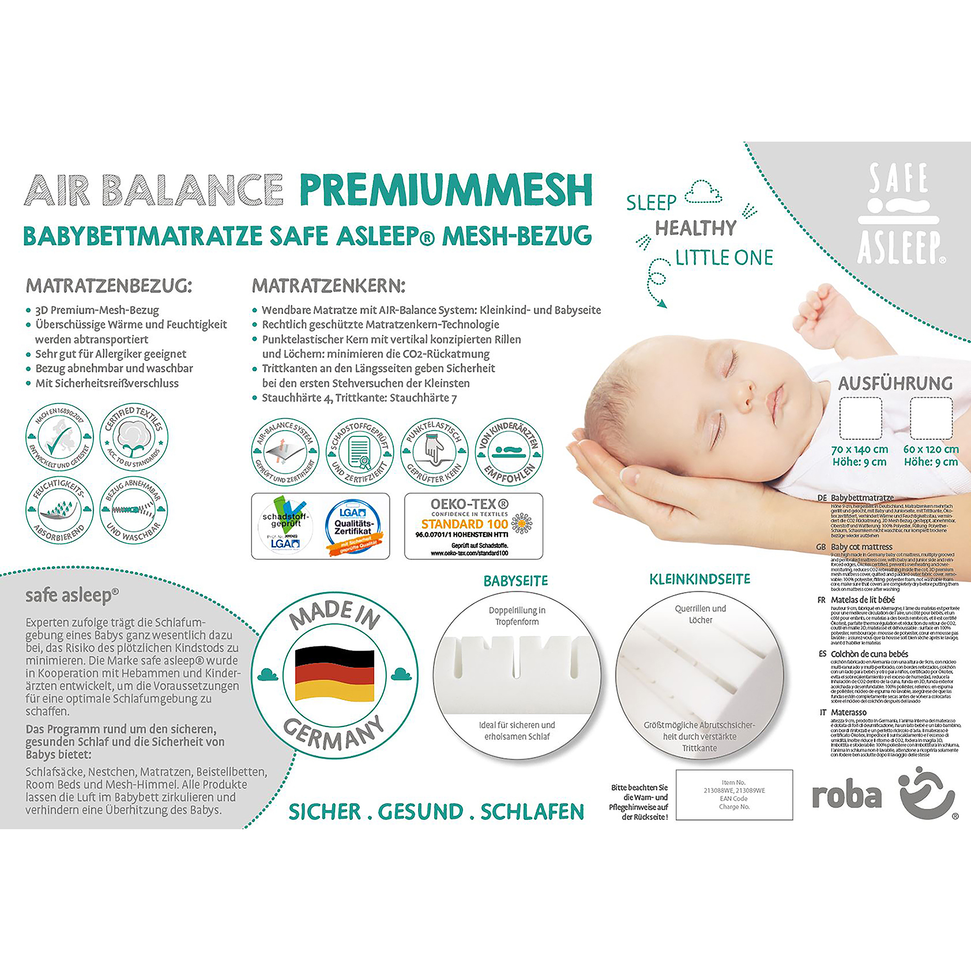 - Die roba Babybettmatratze (70 x 140 cm) AIR BALANCE PREMIUMMESH 'safe asleep®' mit atmungsaktivem 3D Material ist nach aktuellsten Sicherheitsstandards mit Hebammen und Kinderärzten entwickelt.