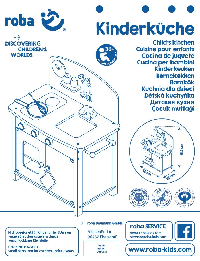 Hiermit steht dem sofortigen Spielstart nichts mehr im Wege! Die Kinderpielküche wird zerlegt geliefert. Die Montage ist kinderleicht. Alle verwendeten Materialien sind nach EN 71-1:2014 schadstoffgeprüft und zertifiziert und werden auch während der Herstellung regelmäßig von uns geprüft.